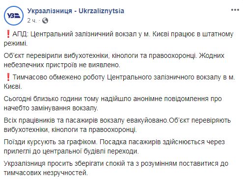 В "Укрзализнцыци" заверили, что на график поездов это не повлияло. Посадка пассажиров происходит на прилежащих к центральному зданию переходах. Работники просят людей сохранять спокойствие и не паниковать.