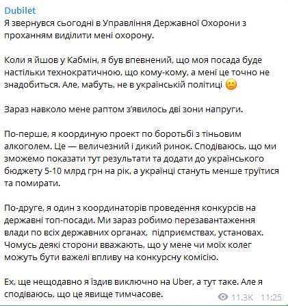 Министр Кабинета министров Дмитрий Дубилет просит предоставить ему государственную охрану. Об этом он написал в своем Telegram.