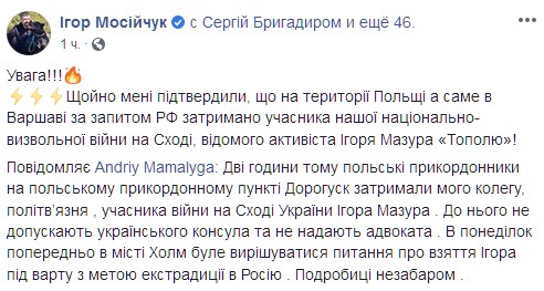Первым о задержании сообщил 9 ноября бывший народный депутат Игорь Мосийчук в Facebook. По его словам, Польша пошла на этот шаг по запросу России.