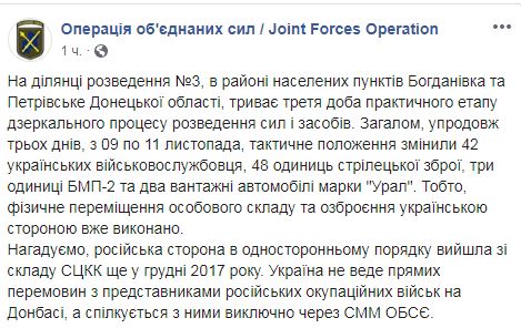 "В общем, в течение трех дней, с 09 по 11 ноября, тактическое положение сменили 42 украинских военнослужащих, 48 единиц стрелкового оружия, три единицы БМП-2 и два грузовых автомобиля марки "Урал". То есть, физическое перемещение личного состава и вооружения украинской стороной уже выполнено", - говорится в вечерней сводке, опубликованной в понедельник вечером.