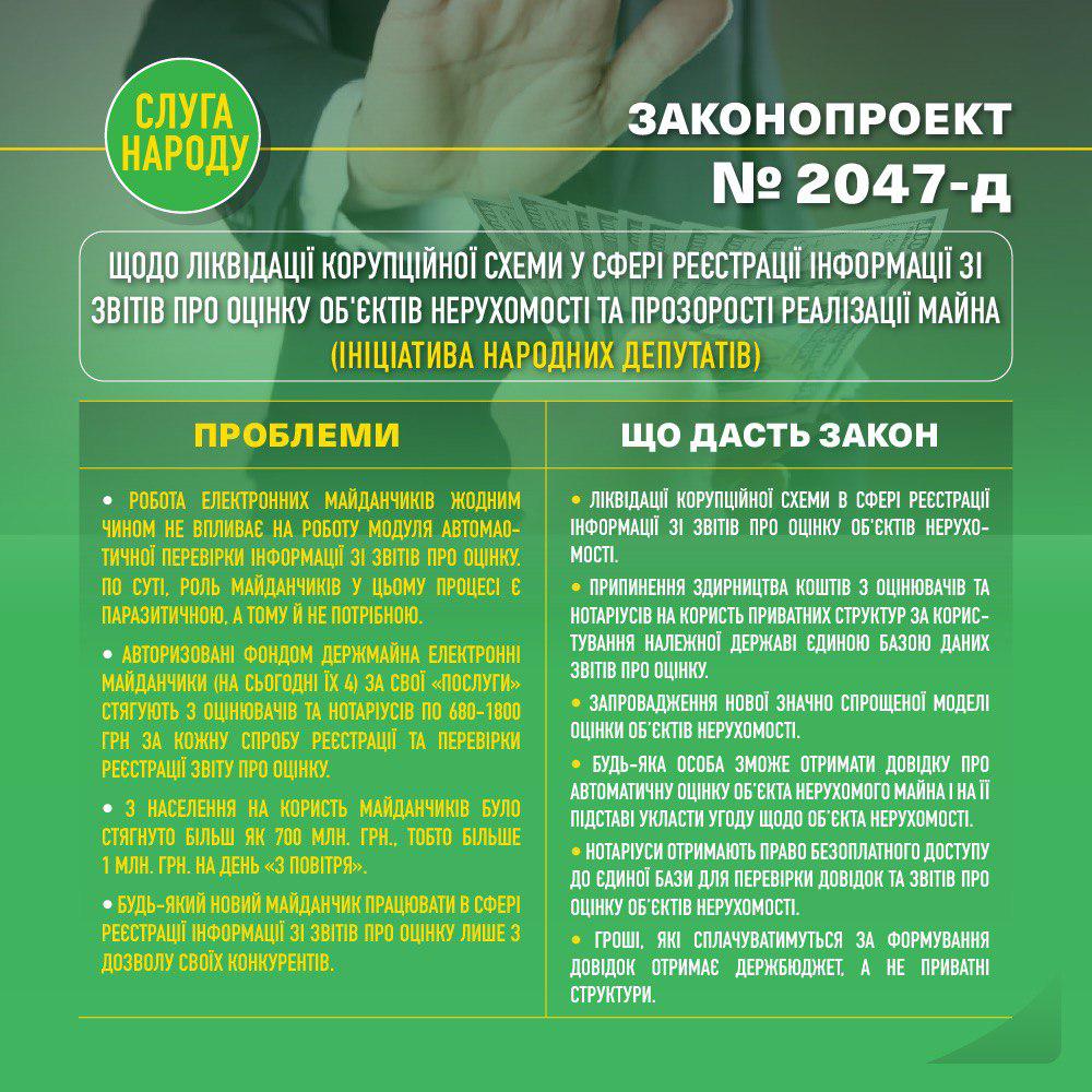 Этот проект считается антикоррупционным и проталкивался руководством партии. Он выводит из схемы оценки жилья посредников - частные онлайн-площадки, которые берут с оценщиков 1800 гривен за каждое обращение в реестр. А в итоге эти суммы ложатся на покупателей квартир.