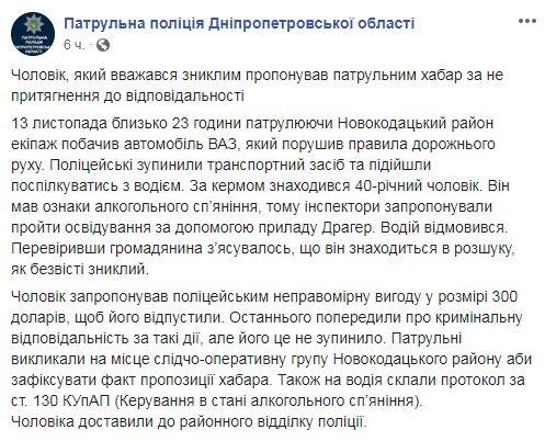 Мужчина предложил полицейским неправомерную выгоду в размере 300 долларов, чтобы его отпустили. Правоохранители предупредили злоумышленника об уголовной ответственности за такие действия, но его это не остановило. Патрульные вызвали на место следственно-оперативную группу. Также на водителя составили протокол по статье 130 КУоАП (управление в состоянии алкогольного опьянения). Мужчину доставили в районный отдел полиции.
