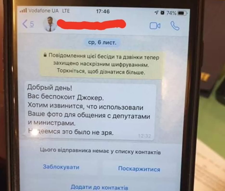 "Вас беспокоит Джокер. Хотим извиниться, что использовали Ваше фото для общения с депутатами и министрами. Надеемся это было не зря", - свидетельствует фото сообщения, которое Джокер прислал Рябошапке.