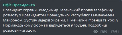 Также в ОП подтвердили, что встреча лидеров Украины, Германии, Франции и России в нормандской формате состоится 9 декабря. Подробности разговора двух лидеров пока не сообщаются.