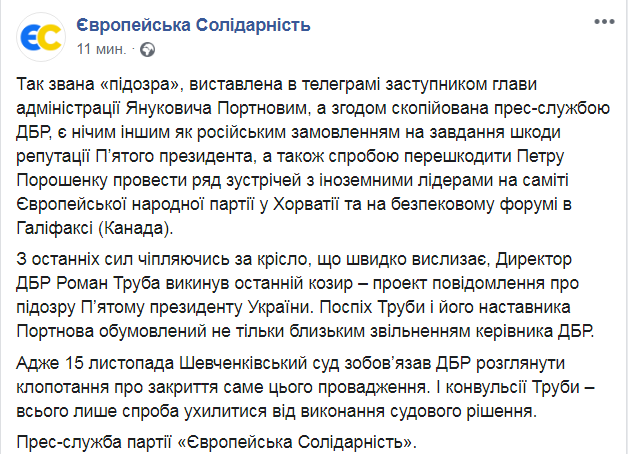 "Так называемое подозрение, выставленное в Telegram заместителем главы администрации Януковича Портновым, а затем скопированное пресс-службой ГБР, является ничем иным как российским заказом на нанесение вреда репутации пятого президента, а также попыткой помешать Петру Порошенко провести ряд встреч с иностранными лидерами на саммите Европейской народной партии в Хорватии и на форуме по безопасности в Галифаксе (Канада)", - заявили в "ПЕС".