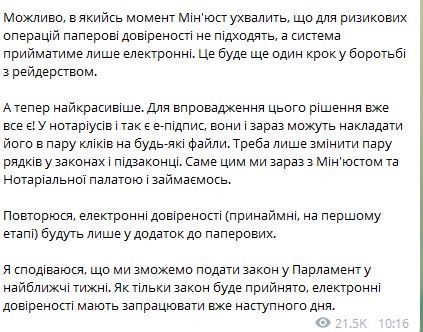В Кабинете министров Украины планируют запустить электронные доверенности, которые должны снизить уровень рейдерства. Об этом сообщил в Telegram министр Кабмина Дмитрий Дубилет.