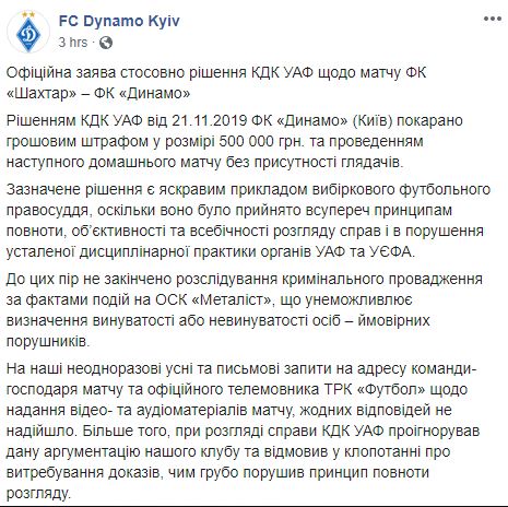 Напомним, что киевское "Динамо" наказано одним домашним матчем без зрителей (плюс один матч без зрителей условно с испытательным сроком до конца сезона 2019-2020).