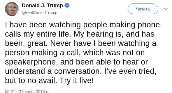 "Я всю свою жизнь вижу людей, которые говорят по телефону. У меня сейчас отличный слух, и он был таким всегда. Я никогда не видел человека, который говорил бы по телефону не на громкой связи, и я бы при этом мог услышать или понять его разговор. Я даже пытался (вслушиваться - Ред.), но это было бесполезно", - написал Трамп в Twitter.