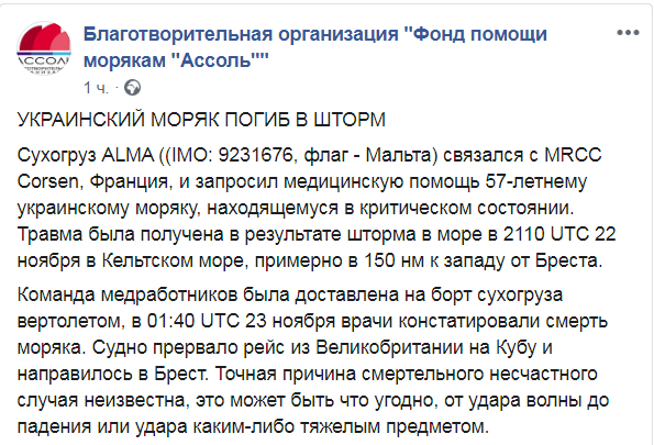 Как сказано в записи в соцсети, 57-летний гражданин Украины работал на сухогрузе Alma, ходящим под флагом Мальты.