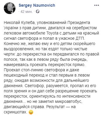 "До перекрестка он (Кулеба - Ред.) передвигался по правой полосе, так как в левом ряду была очередь, намереваясь проехать перекресток прямо. Проехал стоп-линию светофора и стал первым в левом ряду, ожидая возможности для дальнейшего движения. Светофор, разумеется, пропал из его поля зрения и он дал себе разрешение проехать перекресток, ориентируясь по интенсивности движения... но не заметил микроавтобус, двигающийся справа. Результат — на скриншотах", - пишет Наумович.