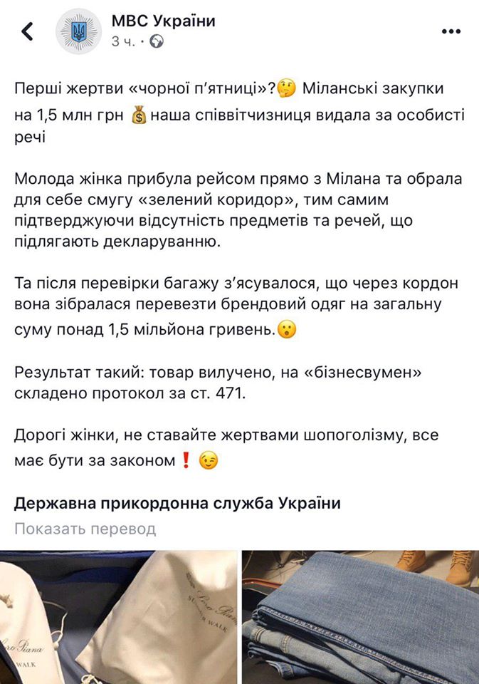 Молодая женщина прибыла в Украину рейсом из Милана и попыталась пронести через "зеленый коридор" одежду на 1,5 млн гривен. Об этом в понедельник, 25 ноября, сообщила пресс-служба МВД Украины в Facebook.
