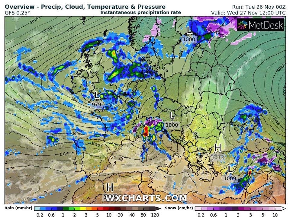 В среду, 27 ноября, в большинстве областей воздух прогреется до + 2....+ 6 градусов, на западе и юге будет + 5...+ 11. В Днепропетровскую, Полтавскую, Кропивницкую области Черноморский циклон принесет порывистый ветер и дожди со снегом.