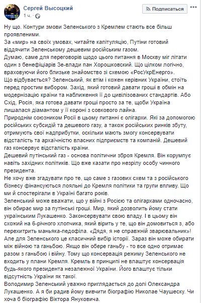Экс-нардеп Сергей Высоцкий, который шел, но не прошел в нынешнюю Раду по списку "Европейской солидарности", написал о заговоре Зеленского с Кремлем и что "дешевый газ консервирует отсталость страны.".