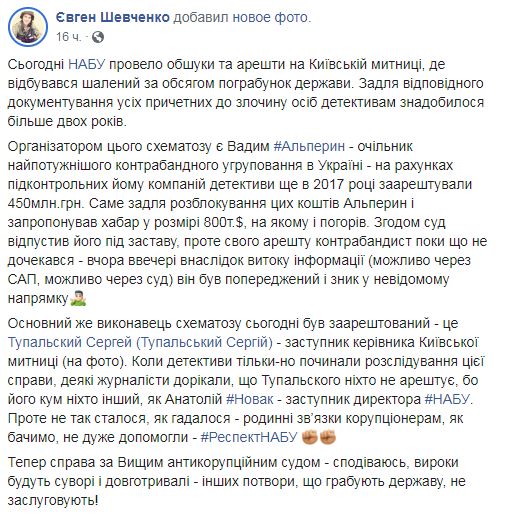 Сотрудничавший с НАБУ бизнесмен Евгений Шевченко обнародовал дополнительную информацию о том, что за обыски вчера проходили на Киевской городской таможне и связал их с делом обвиняемого в контрабанде одесского предпринимателя Вадима Альперина, за поимку которого Зеленский пообещал награду (при этом адвокат Альперина заявил, что он никда не сбегал).