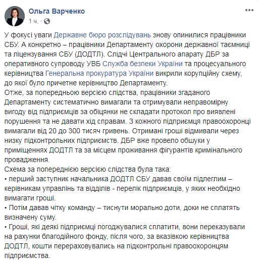 "Итак, по предварительной версии следствия, работники упомянутого департамента систематически требовали и получали неправомерную выгоду от предпринимателей за обещания не составлять протокол о выявленных нарушениях и не давать ход делам. От каждого предпринимателя правоохранители требовали от 20 до 300 тысяч гривен", - написала она.