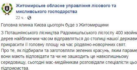 "С Поташнянского лесничества Радомышльского лесхоза 400 хвойных деревьев в ближайшее время отправятся в столицу нашего государства, чтобы украсить ее главную площадь на время рождественско-новогодних праздников", - говорится в сообщении.