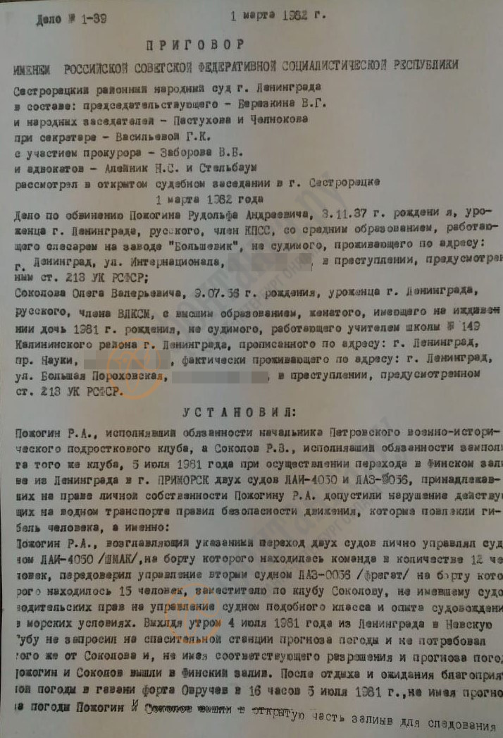 Уточняется, что приговор был вынесен в 1982 году. Из документа следует, что в июле 1981 года погиб ученый Владимир Сорокин при затоплении фрегата "Святой Георгий" в Финском заливе, которым управлял 25-летний Олег Соколов. Он в то время учился на четвертом курсе исторического факультета Ленинградского государственного университета (ЛГУ), параллельно работал школьным учителем и был замполитом в Петровском военно-историческом подростковом клубе.