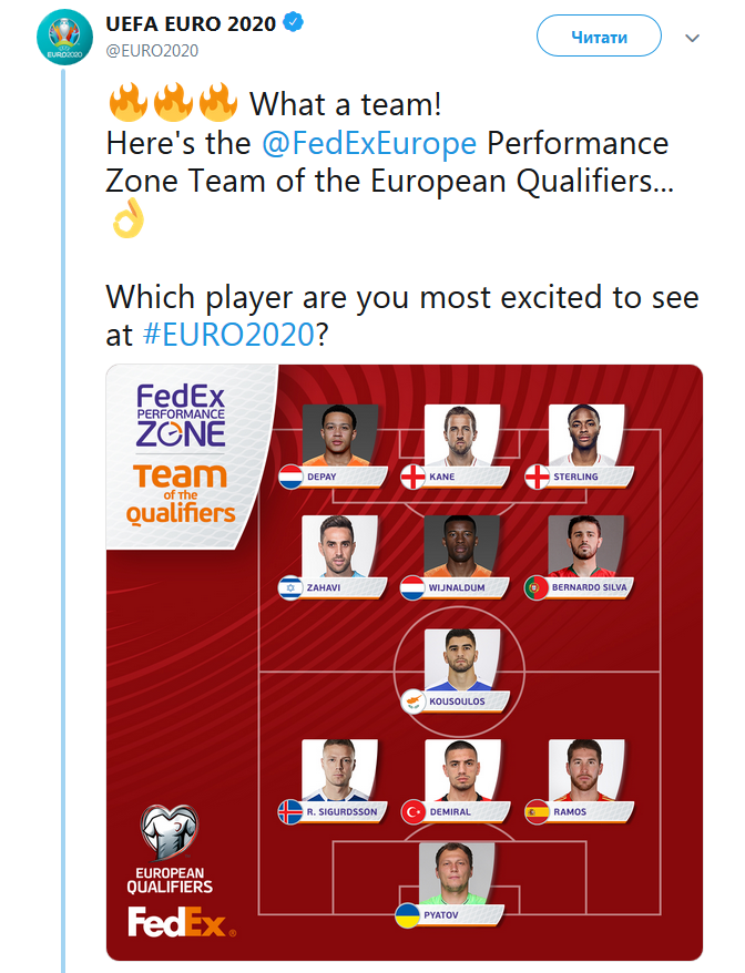 Именно поэтом он и был включен в символическую сборную квалификации Евро-2020 FedEx Perfomance Zone Team. В квалификации Андрей Пятов провел все 8 матчей и пропустил всего 4 гола. Об этом передает официальный Twitter Евро-2020.