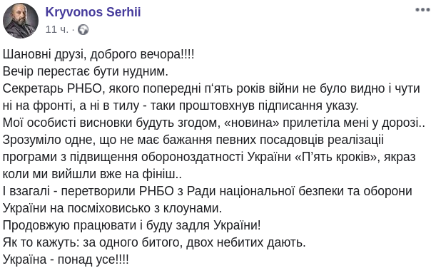 "Мои личные выводы будут впоследствии, "новость" прилетела мне в пути. Ясно одно - что нет желания определенных должностных лиц реализации программы по повышению обороноспособности Украины "Пять шагов", как раз когда мы вышли уже на финиш. И вообще - превратили СНБО из Совета национальной безопасности и обороны Украины в посмешище с клоунами ", - написал Кривонос на своей странице в фейсбуке.