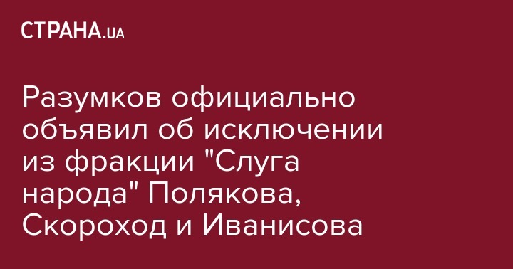"Согласно ч. 3 ст. 60 регламента ВРУ и в соответствии с протоколом заседания депутатской фракции политической партии "Слуга Народа" от 15 ноября 2019 года, сообщаю об исключении из состава депутатской фракции политической партии "Слуга народа" народных депутатов Украины Полякова Антона Эдуардовича и Скороход Анны Константиновны", - сказал Разумков.