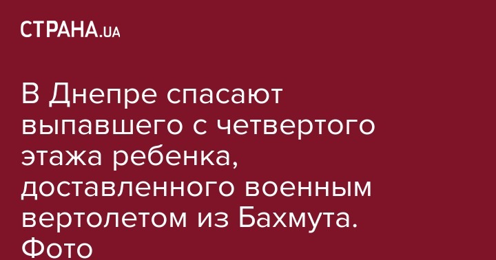 В Днепре медики спасают жизнь 4-летнему малышу, который выпал из окна четвертого этажа в Бахмуте (Донецкая область). В ночь на 3 декабря ребенка в Днепр доставили военным вертолетом в условиях разгулявшегося снегопада. Мальчика передали врачам детской областной больницы. Об этом на своей странице в соцсети написала советник главы Днепропетровской ОГА Татьяна Губа.