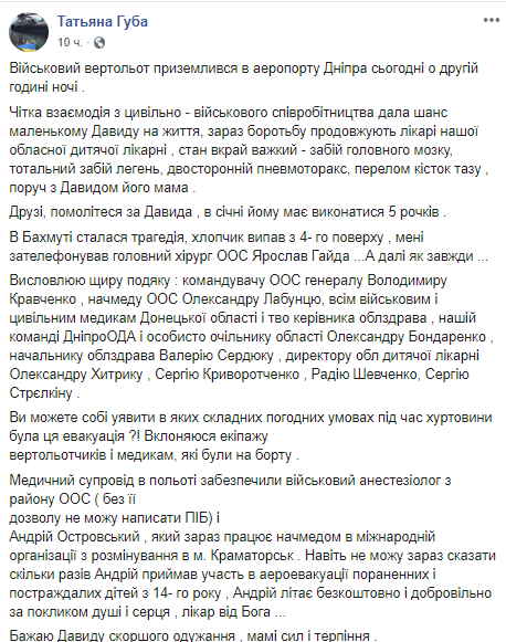 "В Бахмуте произошла трагедия: мальчик выпал с 4-го этажа. Мне позвонил главный хирург ООС Ярослав Гайда, а дальше как всегда… Сейчас состояние ребенка крайне тяжелое: ушиб головного мозга, тотальный ушиб легких, двусторонний пневмоторакс, перелом костей таза", - говорится в посте Губы.