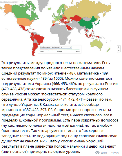 "Это результаты международного теста по математике. Есть также представления по чтению и естественным наукам. Средний результат по миру: чтение - 487, математика - 489, естественные науки - 489 (из 1000). Можно конечно смеяться над результатами Украины (466, 453, 469), но результаты России (479, 488, 478) тоже сложно назвать блестящими, в лучшем случае Россия может "похвастаться" статусом крепкого середнячка. А та же Белоруссия (474, 472, 471) - разве что тем, что лучше Украины. В Казахстане, кстати, все вообще мрачновато:387, 423, 397.