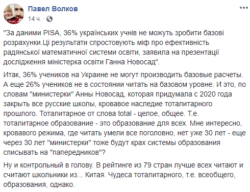 "Итак, 36% учеников на Украине не могут производить базовые расчеты. А еще 26% учеников не в состоянии читать на базовом уровне. И это, по словам "министерки" Анны Новосад, которая придумала с 2020 года закрыть все русские школы, кровавое наследие тоталитарного прошлого. Тоталитарное от слова total - целое, общее. Т.е. тоталитарное образование - это образование для всех. Мне интересно, кровавого режима, где читать умели все поголовно, нет уже 30 лет - еще через 30 лет "министерки" тоже будут крах системы образования списывать на "папередников"?