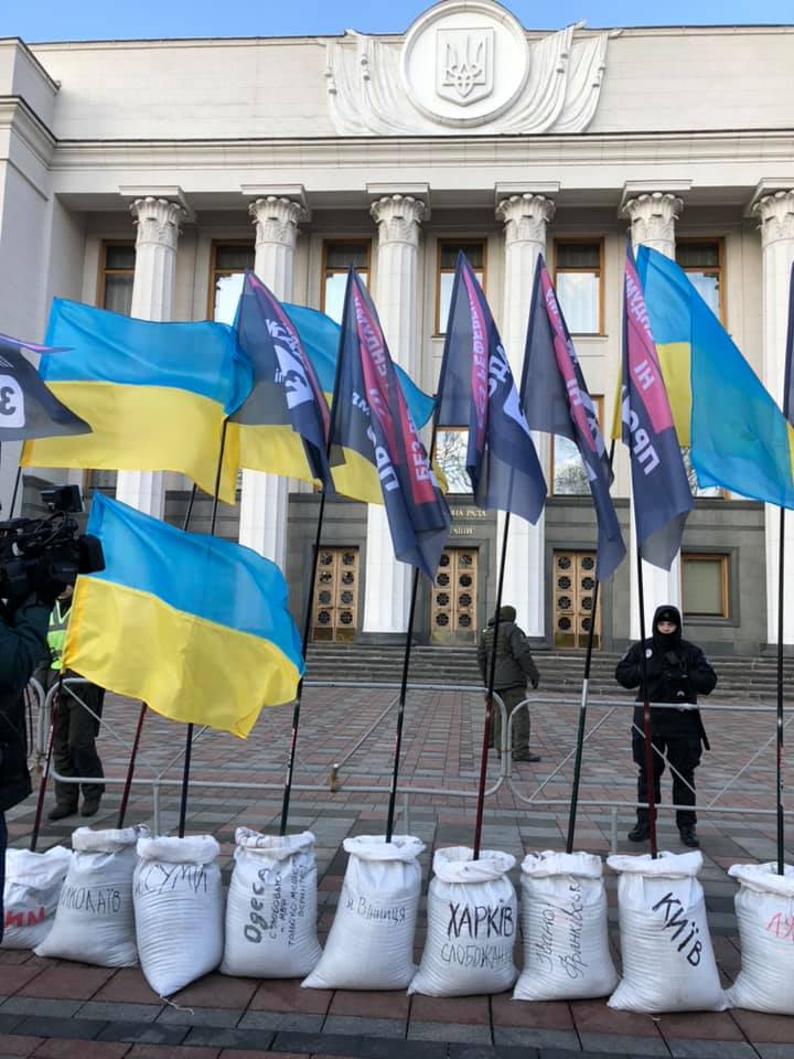 Кроме того, экс-нардеп Надежда Савченко рассыпала перед парламентом мешки с землей и поставила сверху елку, сообщает 112 Украина.