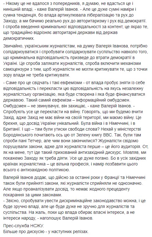 "В частности, есть идея введения административной, уголовной ответственности за так называемое распространение фейков, дезинформации и введения общества в заблуждение. За этими нечеткими критериями мы говорим о том, что снова в Украине может быть уголовная ответственность для журналистов и СМИ. Отдельно мы встревожены инициативой ввести должность омбудсмена по информации. То есть в государстве хотят создать специальное агентство по блокировке вредоносной информации. Мы не хотим, чтобы в Украине создавалась некая надструктура, какой-то надзор над украинскими журналистами и надзор над украинскими медиа, вплоть до блокировки и закрытия медиаканалов", - отмечает Сергей Томиленко.