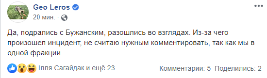 "Да, подрались с Бужанским, разошлись во взглядах. Из-за чего произошел инцидент, не считаю нужным комментировать, так как мы в одной фракции", - написал Лерос в соцсети.