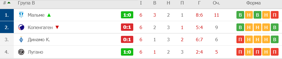 Если "Мальме" не сможет обыграть "Копенгаген", то дальше проходят клубы из столиц Дании и Украины. Если "Копенгаген" уступит с разницей в два гола, то подопечным Алексея Михайличенко будет достаточно минимальной победы над "Лугано", ведь обе игры "Динамо" с "Копенгагеном" завершились вничью, а при одинаковой разнице забитых и пропущенных мячей будет учитываться количество забитых голов.