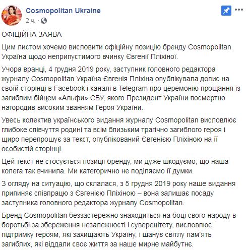 "Хотим выразить официальную позицию бренда Cosmopolitan Украина о недопустимости поступка Евгении Плихиной. Вчера утром, 4 декабря 2019 года, заместитель главного редактора журнала Cosmopolitan Украина Евгения Плихина опубликовала сообщение на своей странице в Facebook и канале в Telegram о церемонии прощания с погибшим бойцом "Альфы" СБУ, которого президент Украины посмертно наградил высоким званием Героя Украины. Весь коллектив украинского издания журнала Cosmopolitan выражает глубокие соболезнования семье и всем близким трагически погибшего героя и искренне извиняется за текст, опубликованный Евгенией Плихиной на ее личной странице. Этот текст не касается позиции бренда, мы очень сожалеем, что наша коллега так поступила. Мы категорически не разделяем ее мнение", – сказано в сообщении.
