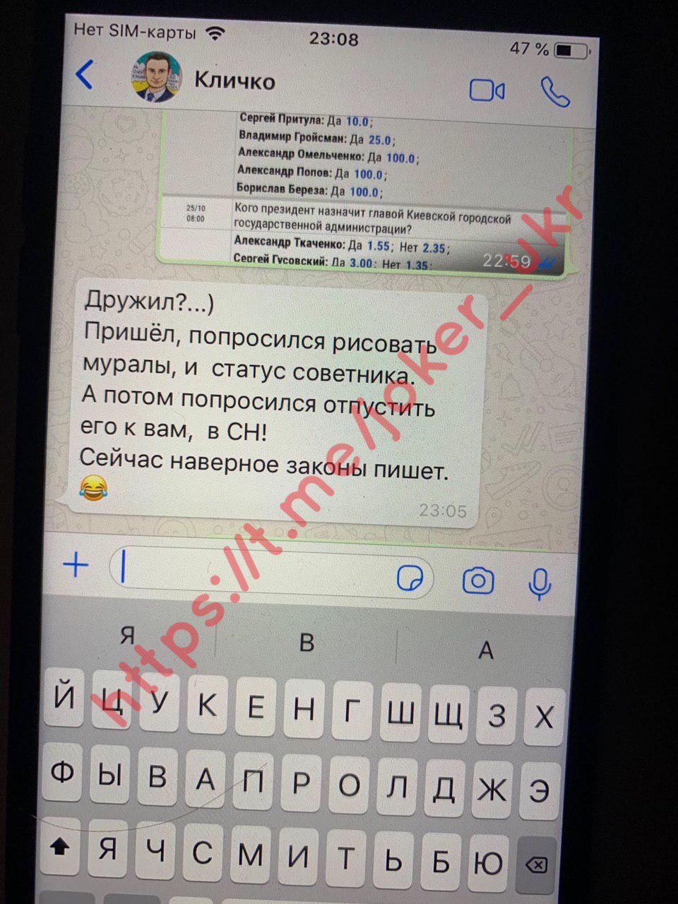По его словам, во время переписки Кличко рассказал, что думает о Леросе, а также поделился мнением о народном депутате от Слуги народа Александре Ткаченко.