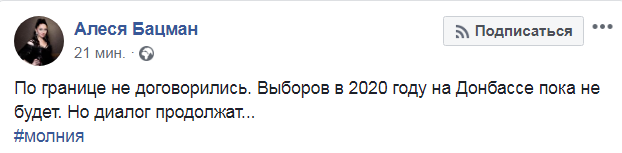 "По границе не договорились. Выборов в 2020 году на Донбассе пока не будет. Но диалог продолжат..." - написала Бацман.