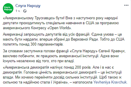 Народные депутаты могут пройти специальное обучение в США по программе Конгресса в 2020 году. Об этом заявил зампредседателя фракции "Слуга народа" Евгения Кравчук, которую цитирует официальная Facebook-страница политсилы.