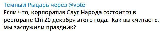 "Если что, корпоратив Слуг Народа состоится в ресторане Chi 20 декабря этого года. Как вы считаете, мы заслужили праздник?", - говорится в сообщении канала.