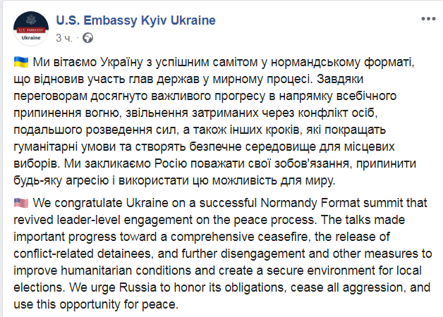 "Мы поздравляем Украину с успешным саммитом в нормандском формате, восстанавливающем участие глав государств в мирном процессе. Благодаря переговорам достигнут важный прогресс в направлении всестороннего прекращения огня, освобождения задержанных вследствие конфликта лиц, дальнейшего разведения сил, а также других шагов, которые улучшат гуманитарные условия и создадут безопасную среду для местных выборов", - говорится в посте пресс-службы посольства.