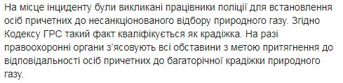 На место инцидента были вызваны сотрудники полиции для установления лиц, причастных к несанкционированному отбору газа. Согласно Кодексу ГРС такой факт квалифицируется как кража. На данный момент правоохранительные органы выясняют все обстоятельства с целью привлечения к ответственности лиц, причастных к многолетней кражи природного газа.