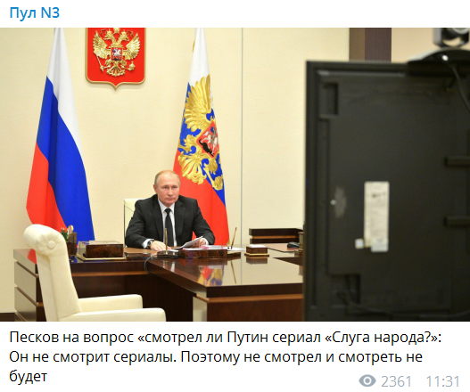"Путин не смотрел "Слугу народа" с Зеленским в главной роли и не планирует этого делать, времени на сериалы у него нет", - сказал пресс-секретарь.