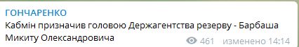 "Кабмин назначил главой Госагентства резерва Барабаша Никиту Александровича", - написал он.