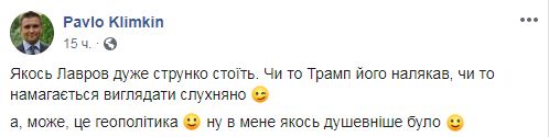 Бывший иностранных дел Павел Климкин оценил фото главы МИД России Сергея Лаврова на закрытой встрече с президентом США Дональдом Трампом. Для сравнения он показал в Facebook собственное фото с главой Штатов.