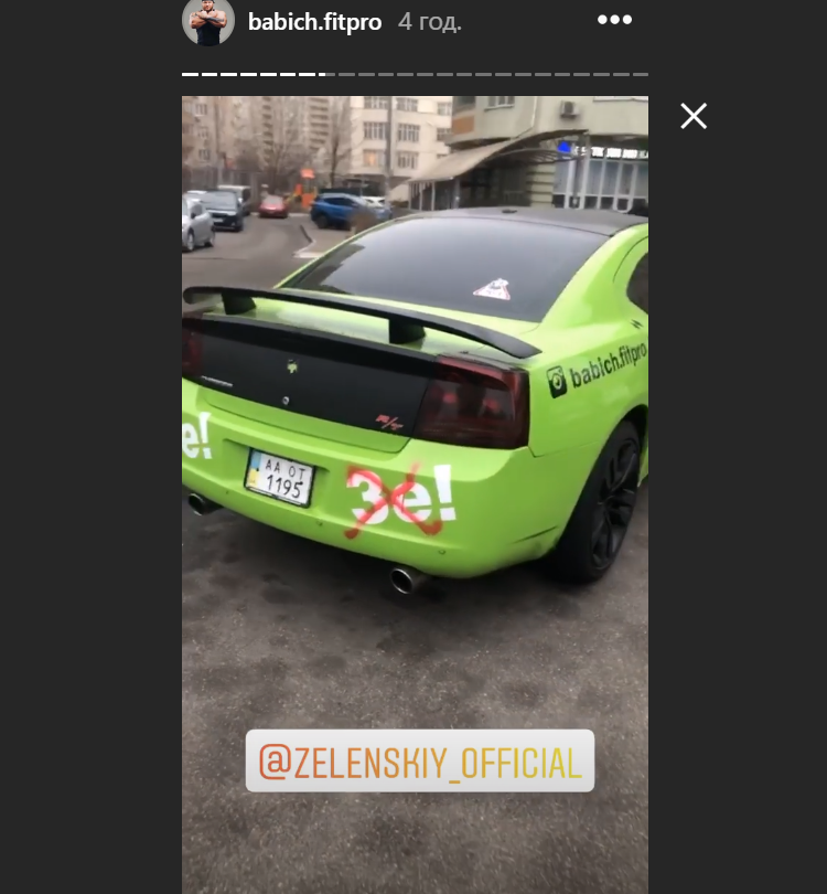 Также опубликовано видео, на котором видно, что его автомобиль Dodge Charger SRT-8, раскрашенный в цвета команды Зеленского, вандалы облили красной краской, перечеркнув слово "Зе". Также вандалы написали оскорбление "Зебил".