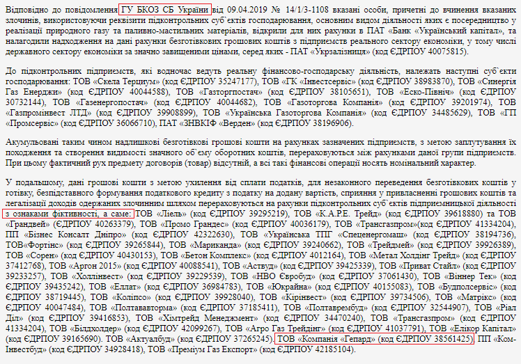 Похожая ситуация и с ОО "Компания "Гепард", которая спонсировала партии Порошенко 3 млн гривен. Она проходит по делу СБУ по факту хищения средств и уклонении от уплаты налогов в крупных размерах, а также отмывании денег.