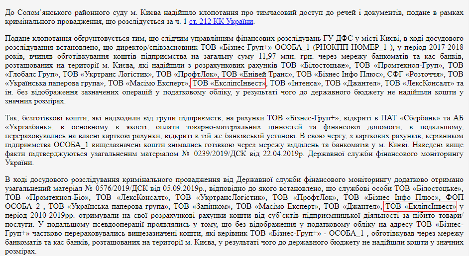 Также по делу об "обнале" проходит фирма "Эклипс инвест", которая заплатила Порошенко 3 миллиона гривен. Согласно материалам суда, должностные лица компании в период 2010-2019 гг. получали на свои расчетные счета средства от субъектов предпринимательской деятельности якобы за товары/услуги. В дальнейшем средства частично перечислялись без отражения в налоговом учете, и руководитель "обнальной" конторы обналичивал их через сеть банкоматов и касс банков, расположенных на территории Киева.