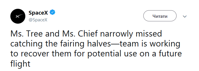 "Ms. Tree и Мs. Chief чуть-чуть не успели поймать половинки обтекателя. Команда работает над тем, чтобы восстановить их для возможного использования при будущем запуске", - говорится в сообщении компании.
