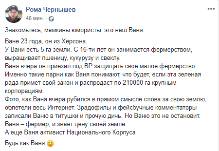 "Ване 23 года, он из Херсона. У Вани есть 5 га земли. С 16-ти лет он занимается фермерством, выращивает пшеницу, кукурузу и свеклу. Ваня вчера он приехал под ВР защищать своё малое фермерство. Именно такие парни как Ваня понимают, что будет, если эта зеленая рада примет свой закон и распродаст по 210000 га крупным корпорациям.