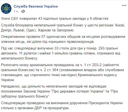 СБУ отмечает, что спецоперации проведены во исполнение поручения президента. Казино ликвидированы в Киеве, Днепре, Львове, Одессе, Харькове и Запорожье. Во время спецоперации изъяли 33 стола для игры в покер, 293 игровых автомата, 11 рулеток и 1 000 000 гривен наличности, полученной от нелегального бизнеса.