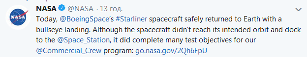 "Космический корабль Starliner от Boeing Space благополучно вернулся на Землю и приземлился точно в яблочко. Хотя космический аппарат не достиг своей намеченной орбиты и не состыковался с космической станцией, он выполнил множество тестовых задач для нашей космической программы", - заявили в NASA.
