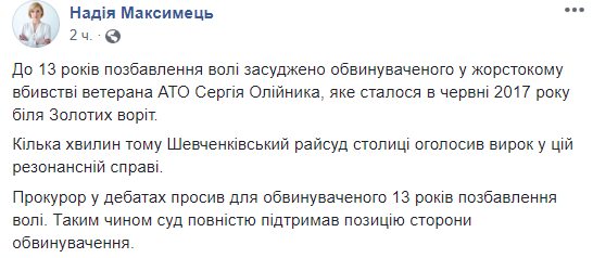 Шевченковский суд Киева арестовал на 13 лет без права на внесение залога подозреваемого в убийстве 57-летнего ветерана АТО Сергея Олейника - Анатолия Чивикова. Убийство произошло 22 июня 2017 года у станции метро "Золотые ворота" в Киеве. О приговоре сообщила пресс-секретарь прокуратуры города Киева Надежда Максимец на своей странице в Facebook.